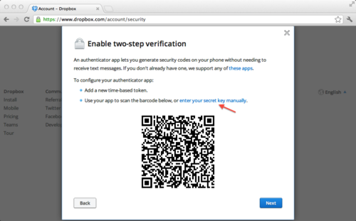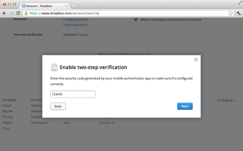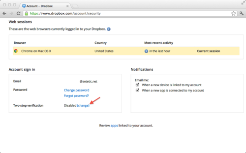 Getting started with Dropbox 2-step, OneTime and a Yubikey is very easy. You'll need to install OneTime on your computer and launch the application. Then, login to your Dropbox account page, locate the two-step verification status, and click "change".