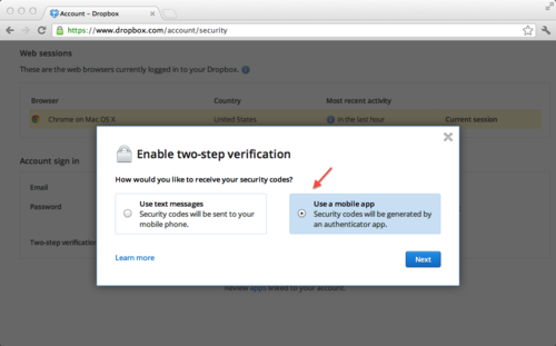 Follow through the informational screens until you are prompted to choose a 2-step verification method. Choose to use a Mobile App instead of SMS.
