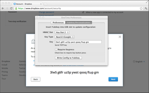 Dropbox has made security-conscious users very happy with the recent addition of two-factor authenitication using OATH-TOTP. We are now pleased to announce that the latest version of OneTime for Yubikey adds support for Dropbox, allowing Yubikey owners to use their USB devices for 2-step verification on Mac OS X.