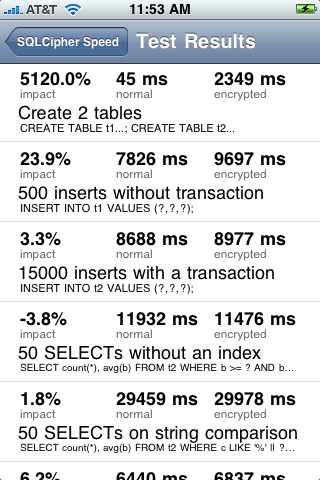 If you’ve been wondering what kind of performance hit you can expect using SQLCipher as compared to vanilla-SQLite, we’ve published a new tool to help you get an idea. In the end,EXPLAIN and EXPLAIN QUERY PLAN cannot be replaced, but for a quick side-by-side reference to see that we’ve done a half-decent job, check out Stephen’s SQLCipherSpeed. It’s an iPhone OS project that rips through the various SQLite speed tests. I ran it on my crunky iPhone 3G and the results were about what I expected, and pretty interesting: